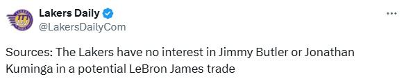 北京时间8月25日,据湖人媒体Lakers Daily报道,消息人士透露,湖人对勇士前锋吉米-巴特勒和乔纳森-库明加不感兴趣,不会在潜在的勒布朗-詹姆斯交易中考虑他们。